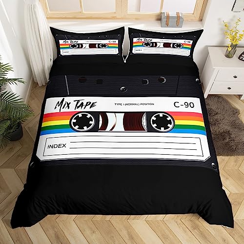 Homewish Classical Music Theme Comforter Cover Rainbow Plastic Tapes Bed Set, Old Fashion Mix Tape Duvet Cover Single Black Retro Audio Cassette Bedding Sets, Music Record Player Bedspread Cover