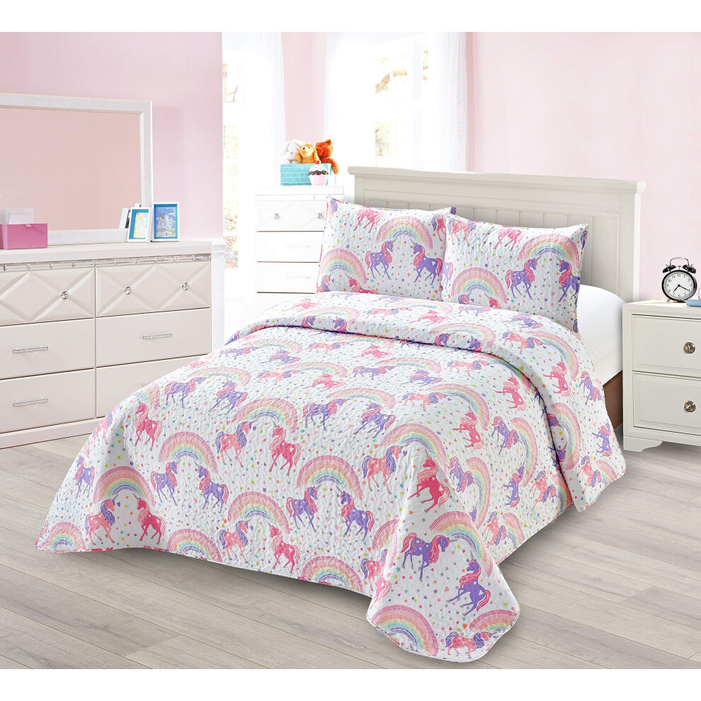 3pc Full/Queen Quilt Bedspread Set Kids/Teens Girls Unicorn Rainbow Pink Purple White New