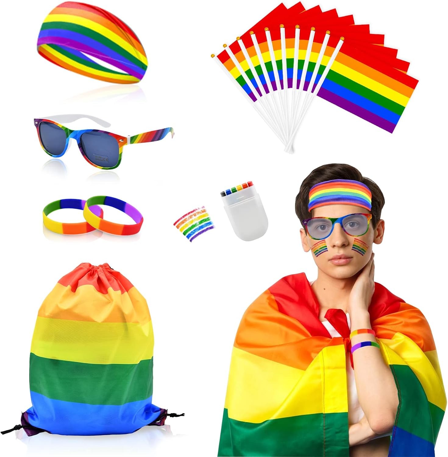 17 Pieces Rainbow Pride Set - Rainbow Headband Glasses Face Paint Cape Mini Handheld Flags Sports Bracelets Drawstring Bag for LGBTQ Pride Accessories Pride Month Party Supplies