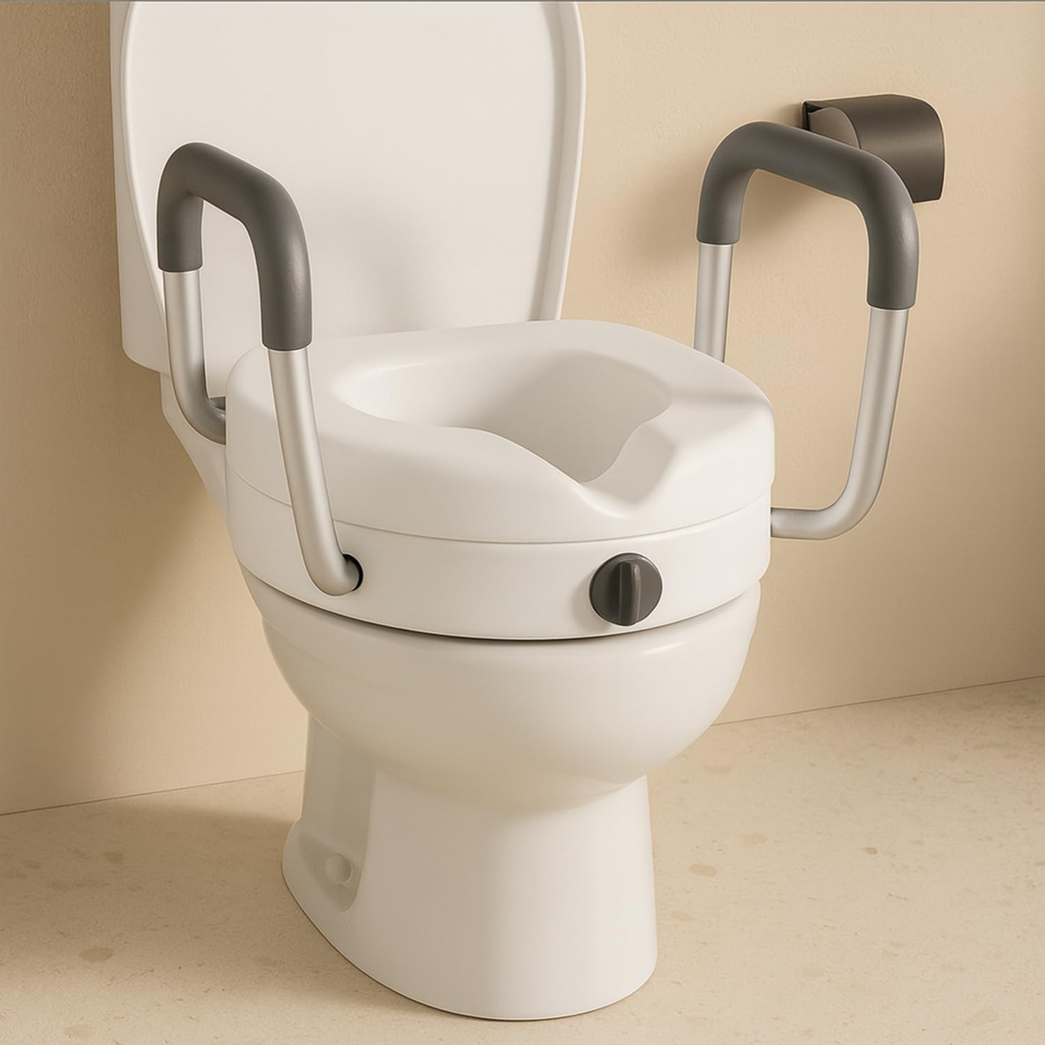 Raised Toilet Seat Riser with Handles Adds 4 Inches (10cm) Height, Foam Padded Arms, Tool-Free Installation, Easy Fit, Secure Mounting Ideal for Seniors & Recovery