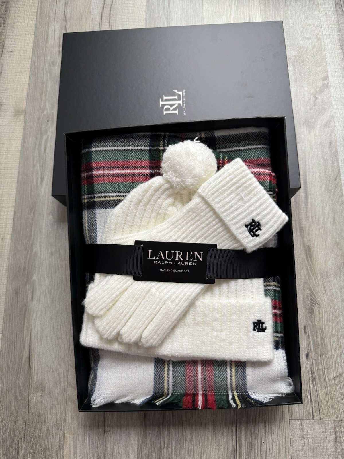 New Lauren Ralph Lauren PLAID SCARF, GLOVES & BEANIE GIFT SET cream stewart