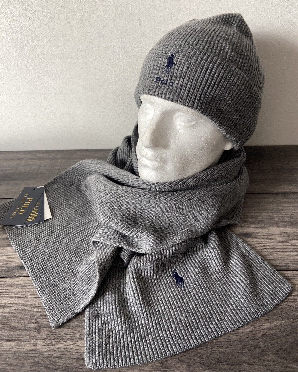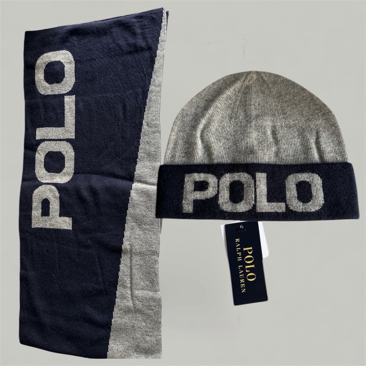 POLO RALPH LAUREN Wool Blend Navy Grey Scarf Beanie Hat Gift Set GENUINE ~ BNWT