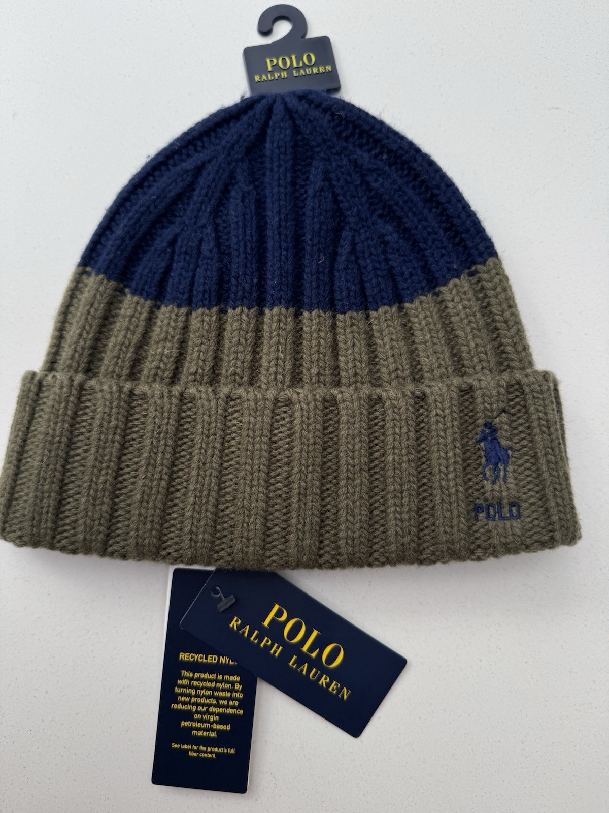 BNWT Polo Ralph Lauren Olive ,Navy Wool Blend Wide Beanie Knitted Hat