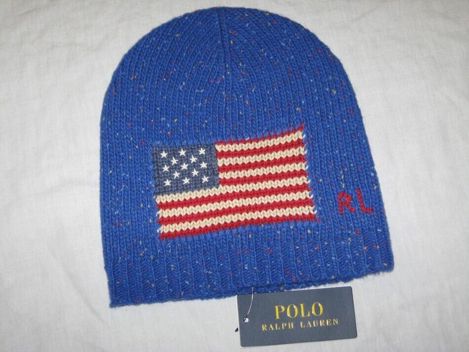 BNWT RALPH LAUREN Rib Knit Lambswool Blend American Flag Beanie Hat Blue