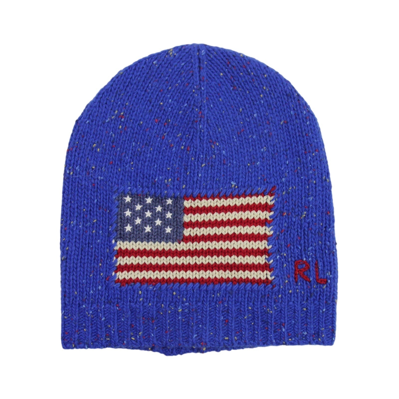 Ralph Lauren Beanie Hat Unisex Adults One Size Blue Lambswool Polo USA Flag BNWT