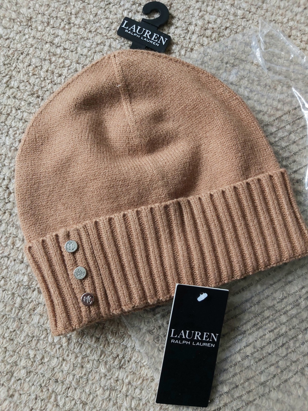 Genuine LAUREN RALPH LAUREN Camel Cuff BEANIE Hat 3 Buttons 454823087004 Ralp1