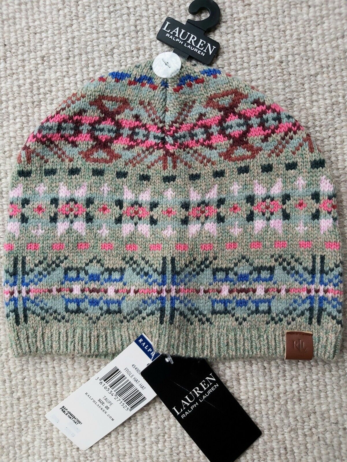 Genuine RALPH LAUREN Taupe Pink Fairisle 27% Wool HAT BEANIE 454928470001 Ralp1