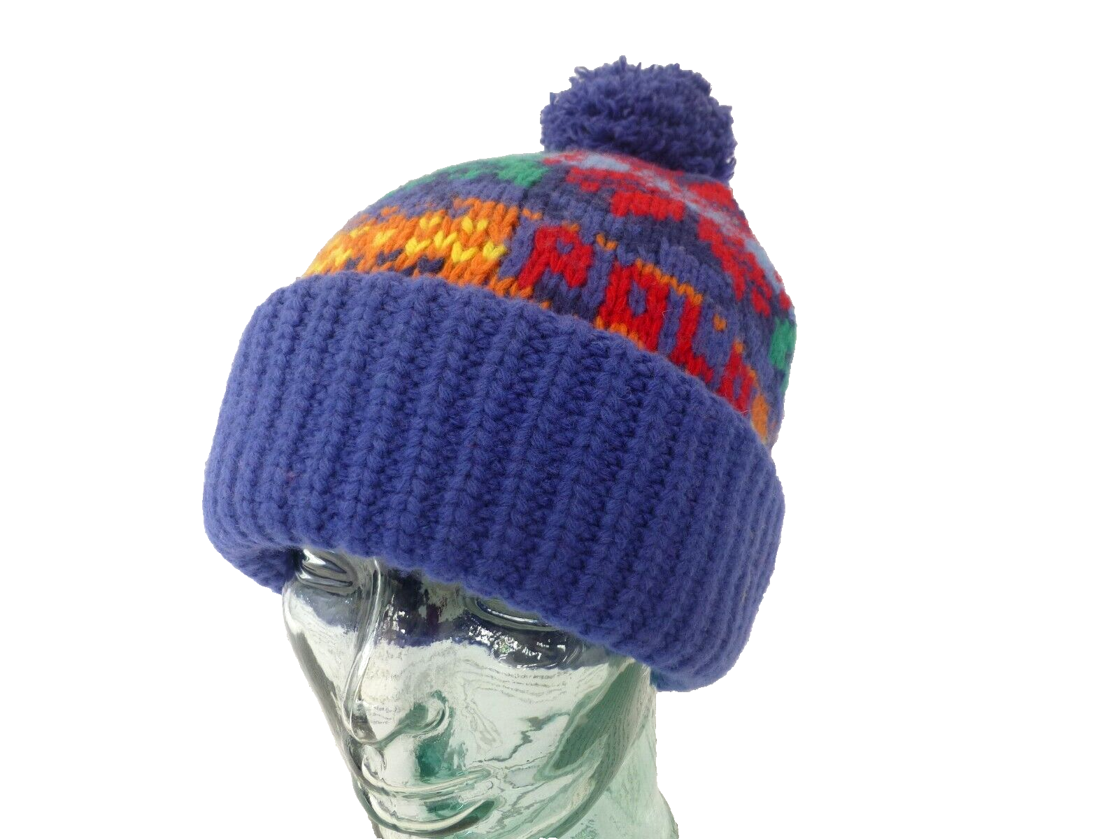 POLO RALPH LAUREN BLACK Wool-Blend Beanie Cuff rib-knit Hat Multicolor Pony