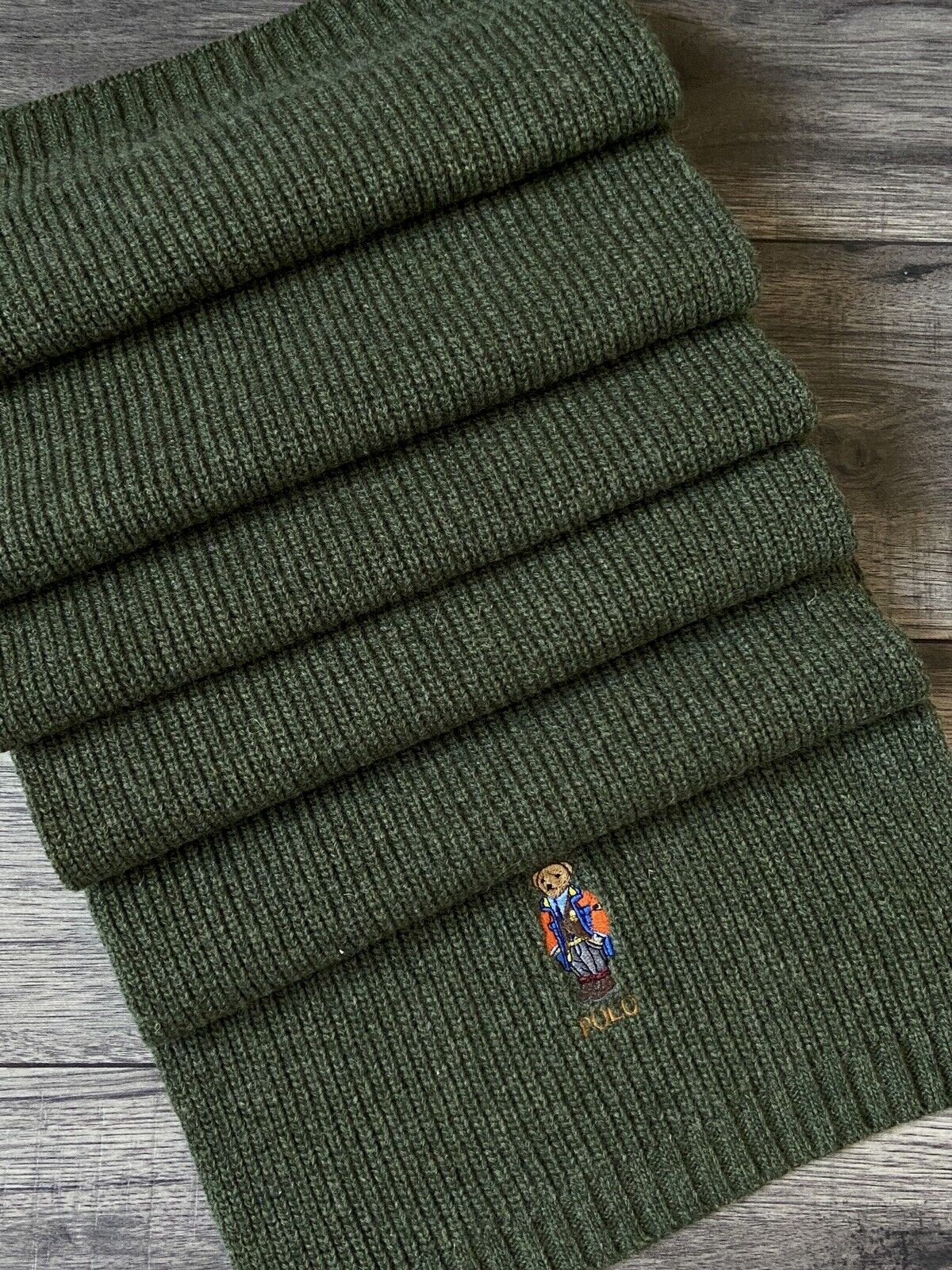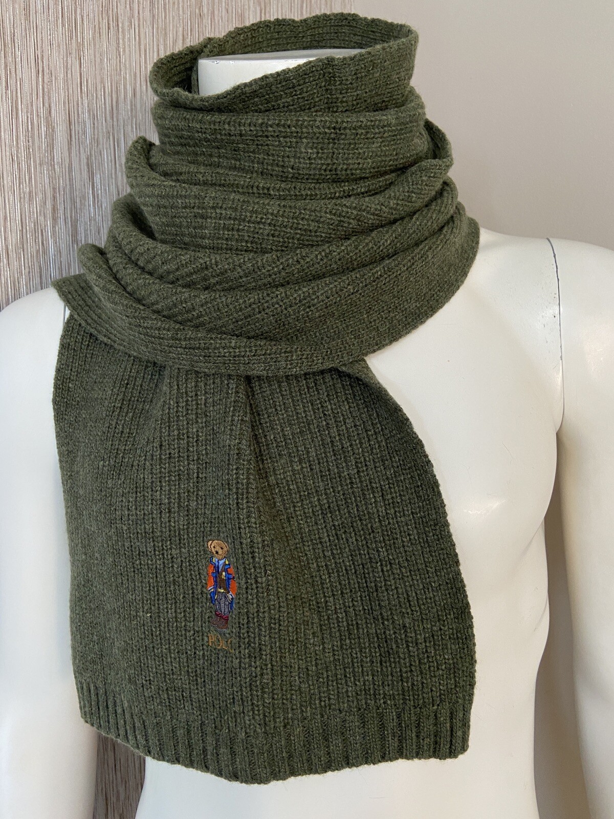 POLO RALPH LAUREN POLO BEAR RIB KNIT WOOL BLEND SCARF OLIVE GREEN BNWT