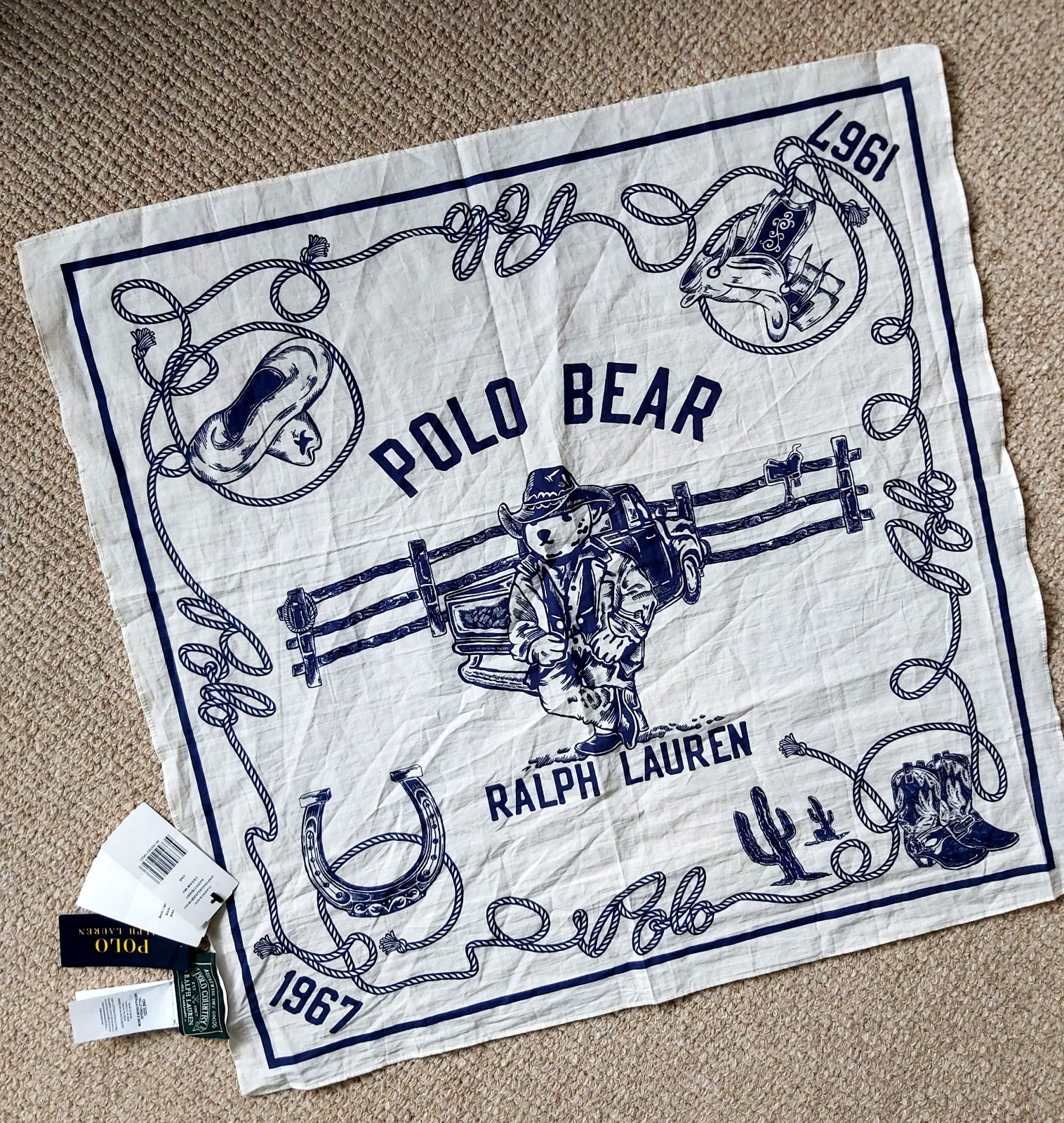 Genuine POLO RALPH LAUREN Bear Cream Navy Neckerchief Country Bandana 24" ralph1