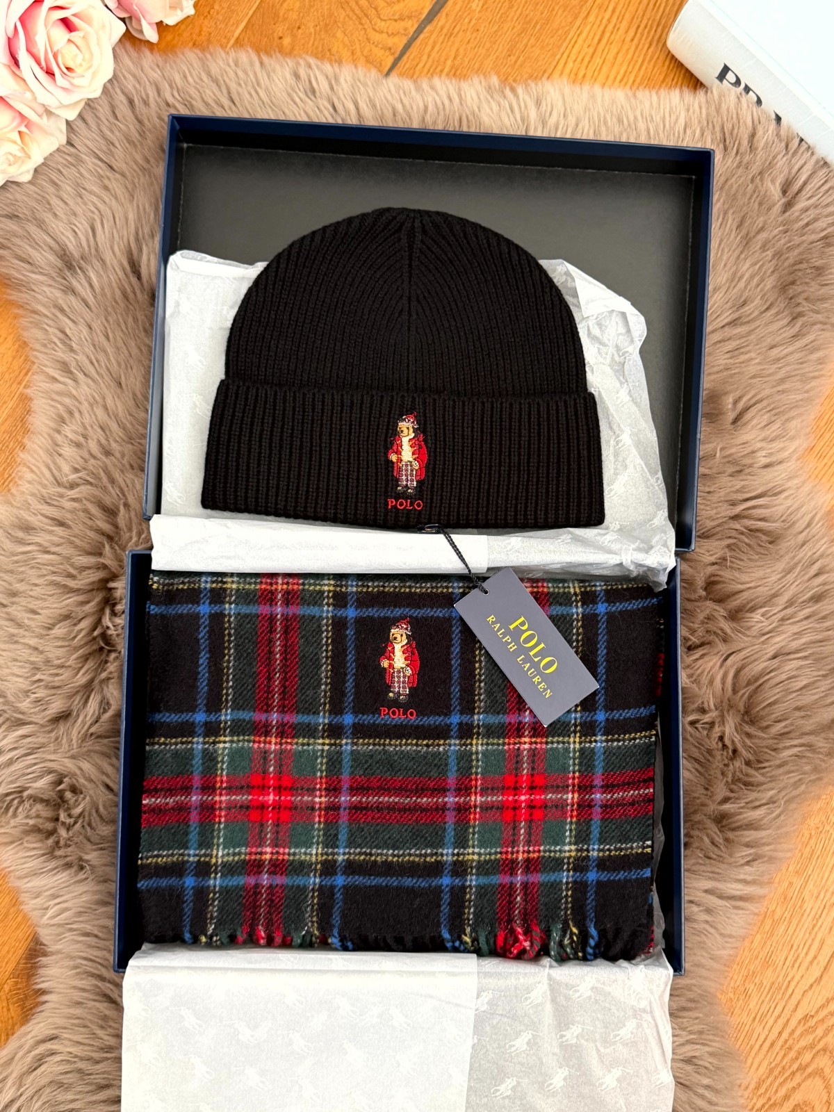 Polo Ralph Lauren Tartan Bear Wool 2 Piece Gift Set Beanie Hat & Scarf