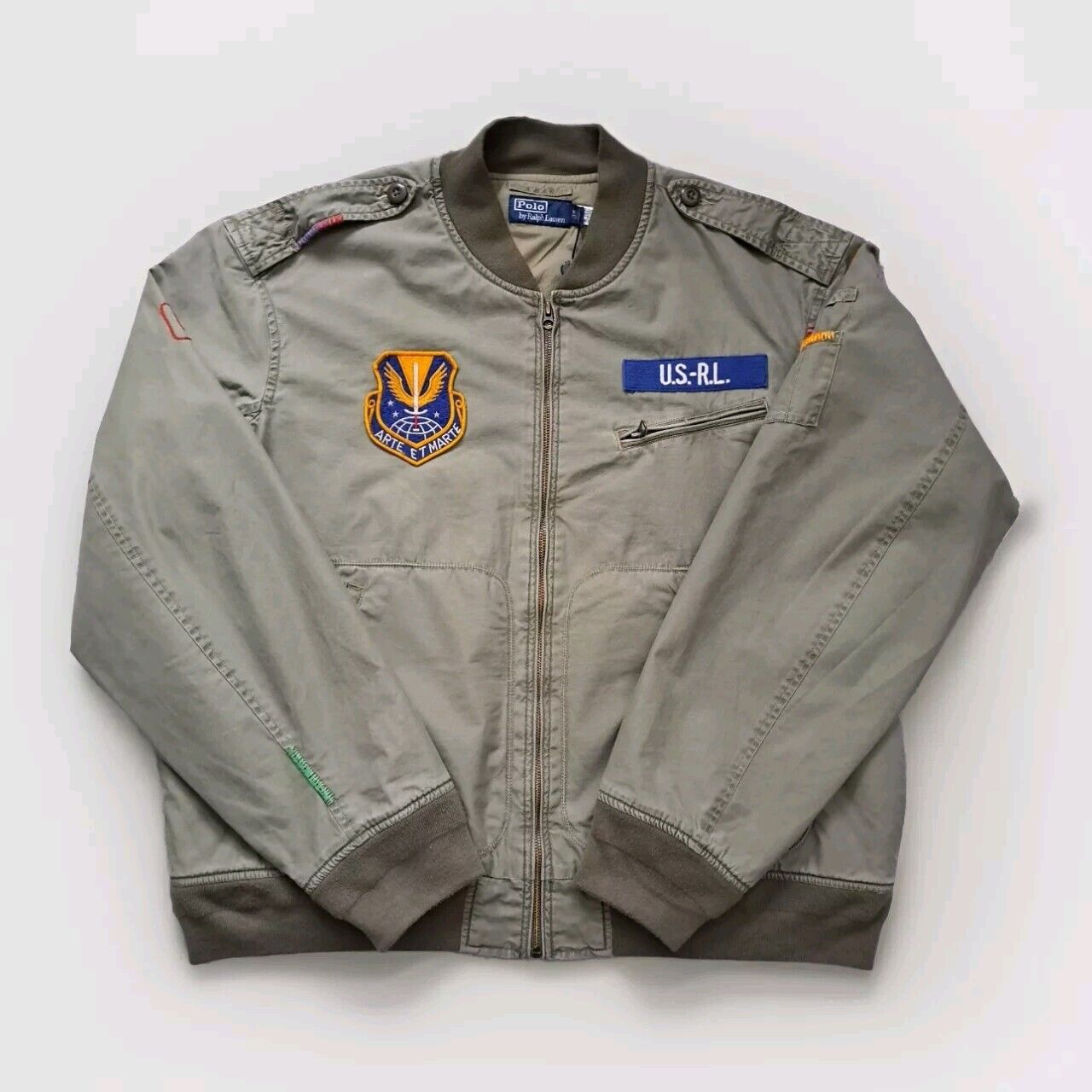 POLO RALPH LAUREN LOVE PEACE EMBROIDERED BOMBER JACKET IN OLIVE .SIZE XXL