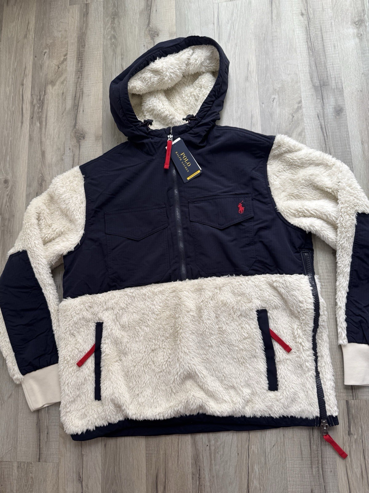 BNWT Polo Ralph Lauren Cream Navy Pile Fleece Hybrid Jacket Size M. RRP£285