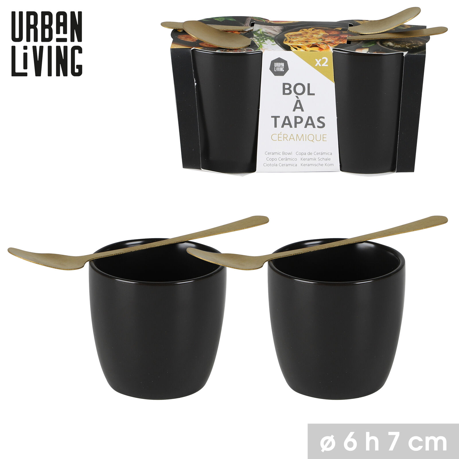 Tapas Dish Bowl with Gold Spoon Set Ceramic Pot Ramekin Dessert 6cm Black 2pcs