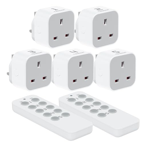 TESSAN Remote Control Plug Socket UK, 30M/100ft Operating Range, Wireless Light Switch for Indoor String Lights, Lamps, 2 Remotes and 5 Sockets