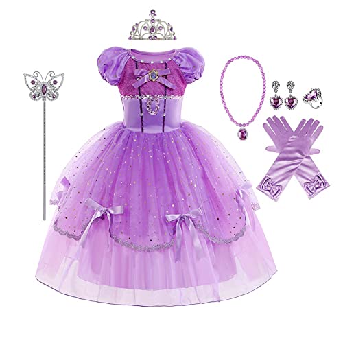 Eleasica Fancy Dress for Girls and Toddler Rapunzel Sofia Costume Magic Wand Tiara Necklace Ring Earrings Dress Up for Cosplay Pageant Tutu Puffed Sleeve Christmas Carnival,Purple,140