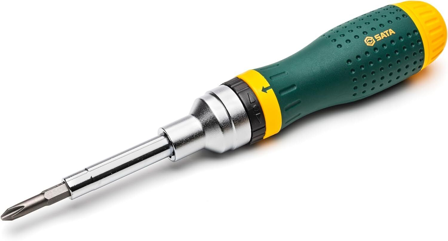 SATA ST09350 19-in-1 Multipurpose Ratcheting Screwdriver Set with 8 Double-Sided Bits and a Green and Yellow Oil-Resistant Handle