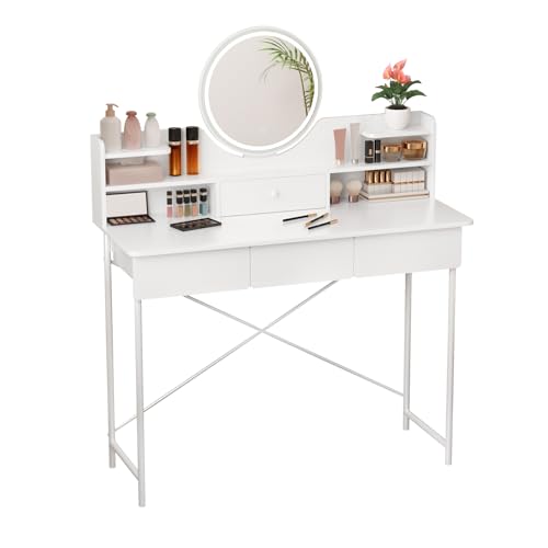 Dressing Table with Mirror and Stool, Dressing Table with LED Mirror, Makeup Table, 4 Drawers Rattan, Adjustable Light with 3 Colours, Bohemian Style, Bedroom