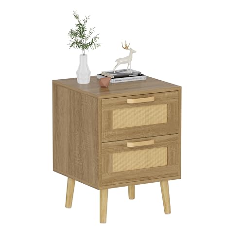 Huhote Bedside Table, Boho Wood Nightstand, Side Table with Rattan Decorated Drawers, Modern Bedside Cabinet, Bedroom End Table with Storage, Quick Easy Assembly (Wood Color)