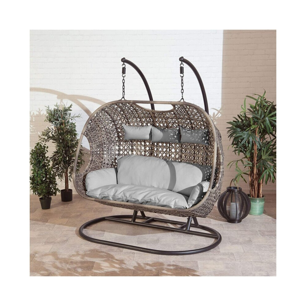 Furniturebox UK Grey Rattan Double Egg Chair for 2 – Indoor Outdoor Snug Seat with Cushions – Boho Patio or Conservatory Chair – Cosy Reading Nook Furniture For Garden Living Room or Bedroom