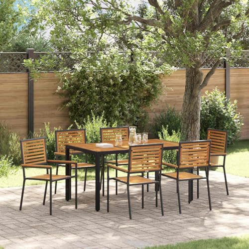 QJBSAVVA 7pc Garden Dining Set, 150×90×75 cm Poly Rattan Table + 6 Chairs, Steel Frame, Acacia Arms, Black-Brown
