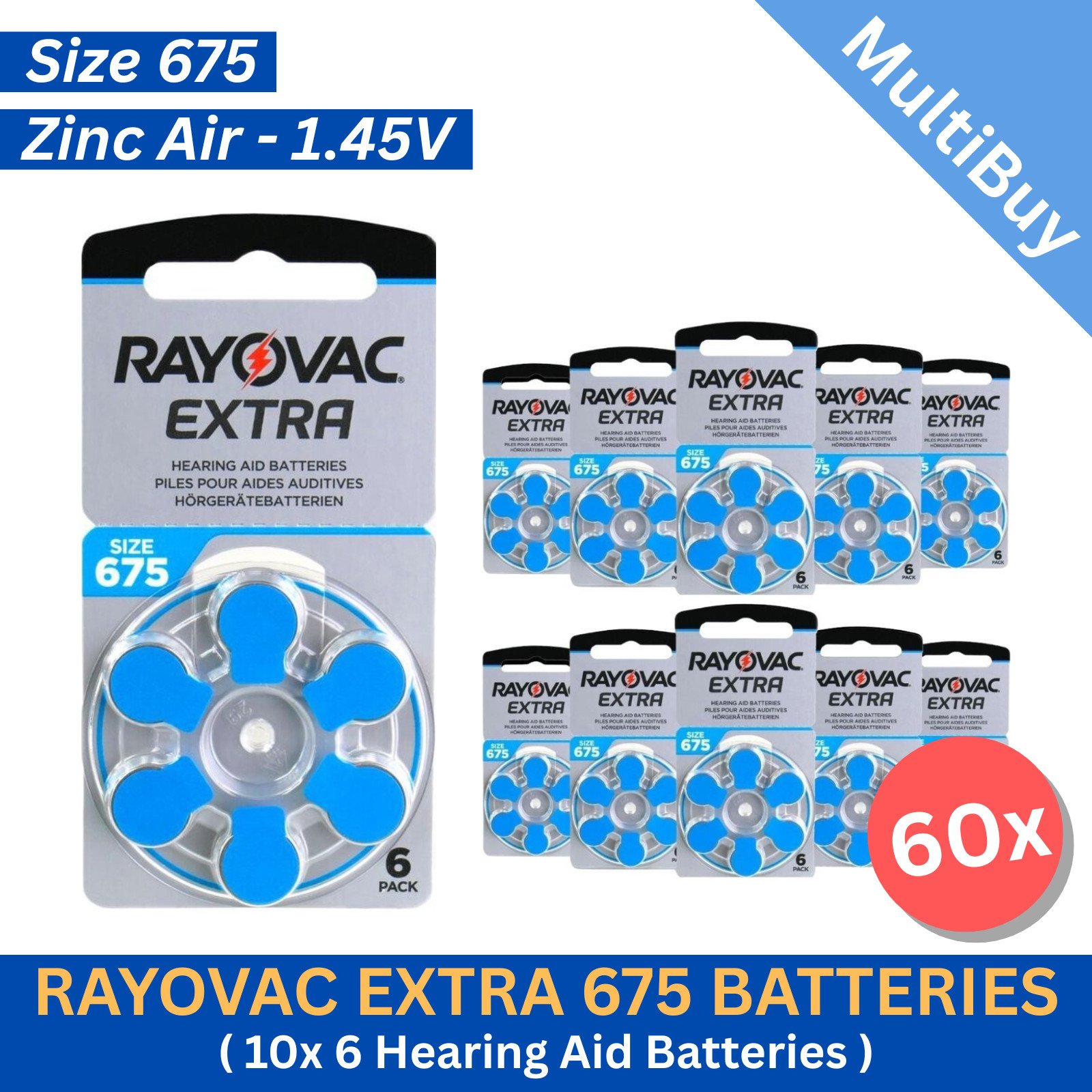 60x Rayovac Extra 675 Hearing Aid Batteries. PR44 1.45V Zinc Air Battery - BLUE
