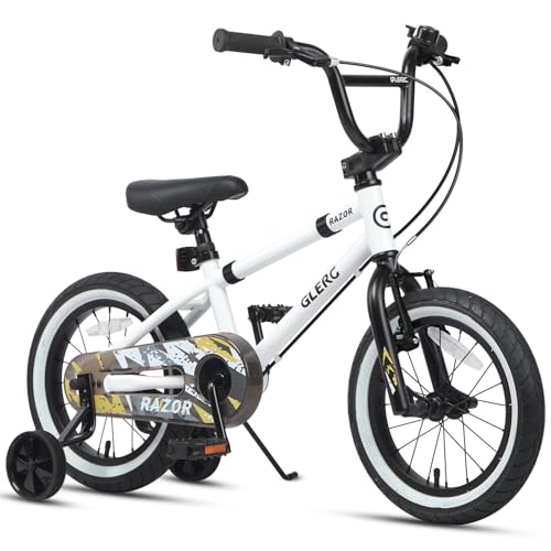 Glerc Razor 16 Inch Kids Bike for 4 5 6 7 Years Old Boys Youth First BMX Style Bicycle with Kickstand & Safety Bell & Removable Stabilisers, White