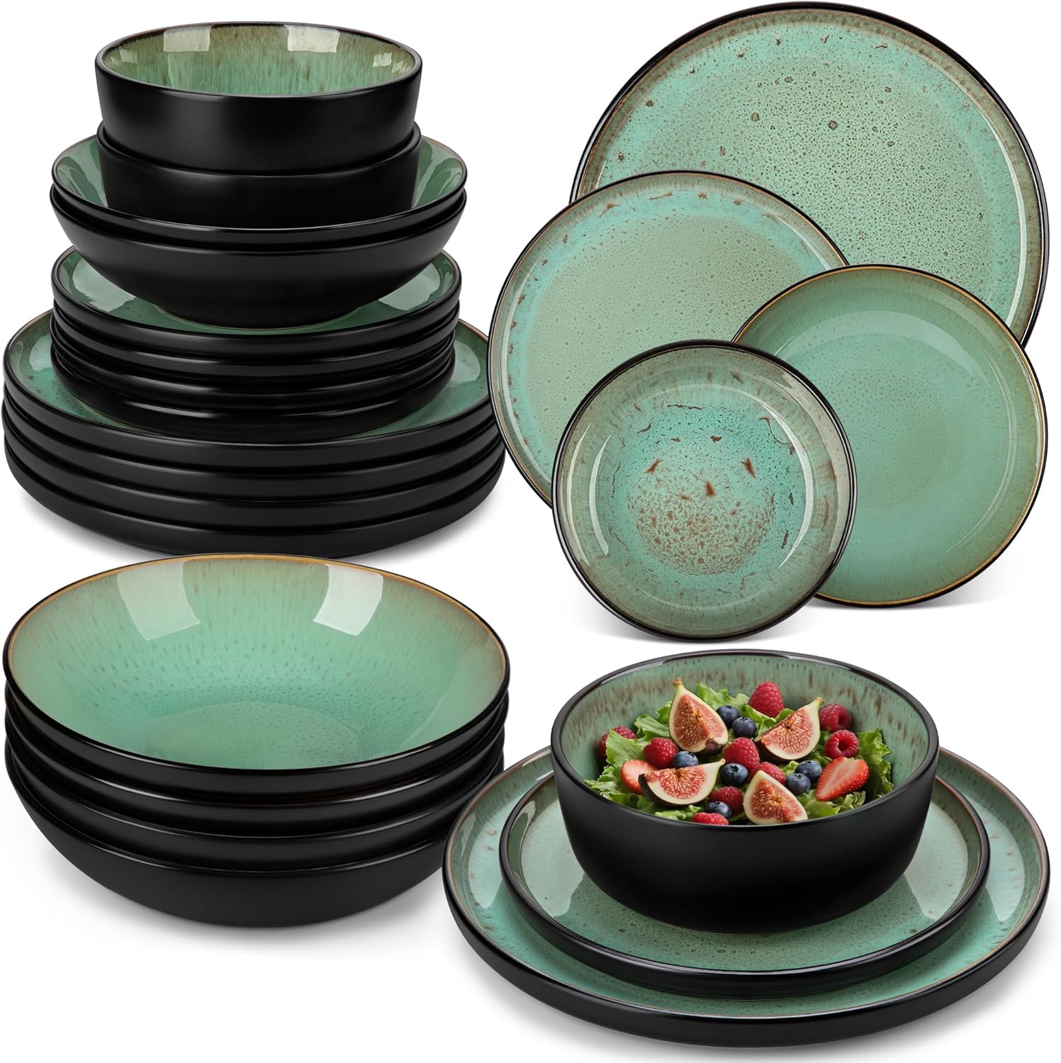 vancasso Amber 18 Pieces Dinner Set for 6, Reactive Glaze Stoneware Plates and Bowls Set, Green Crockery Set with Dinner Plates, Dessert Plates & Cereal Bowls, Microwave & Dishwasher Safe