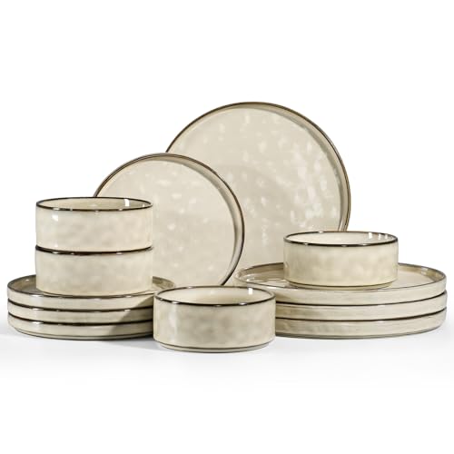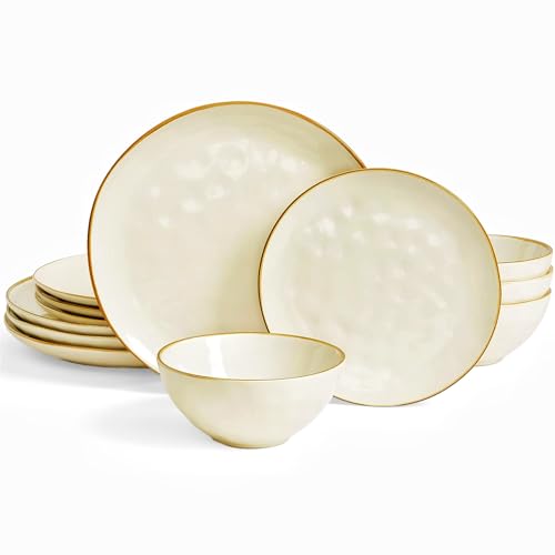 HaWare Dinner Set, 12 Piece Stoneware Dinnerware Service for 4, Reactive Glaze Dining Ware Include Plates and Bowls, Chip and Scratch Resistant, Microwave & Dishwasher Safe, Cream Khaki