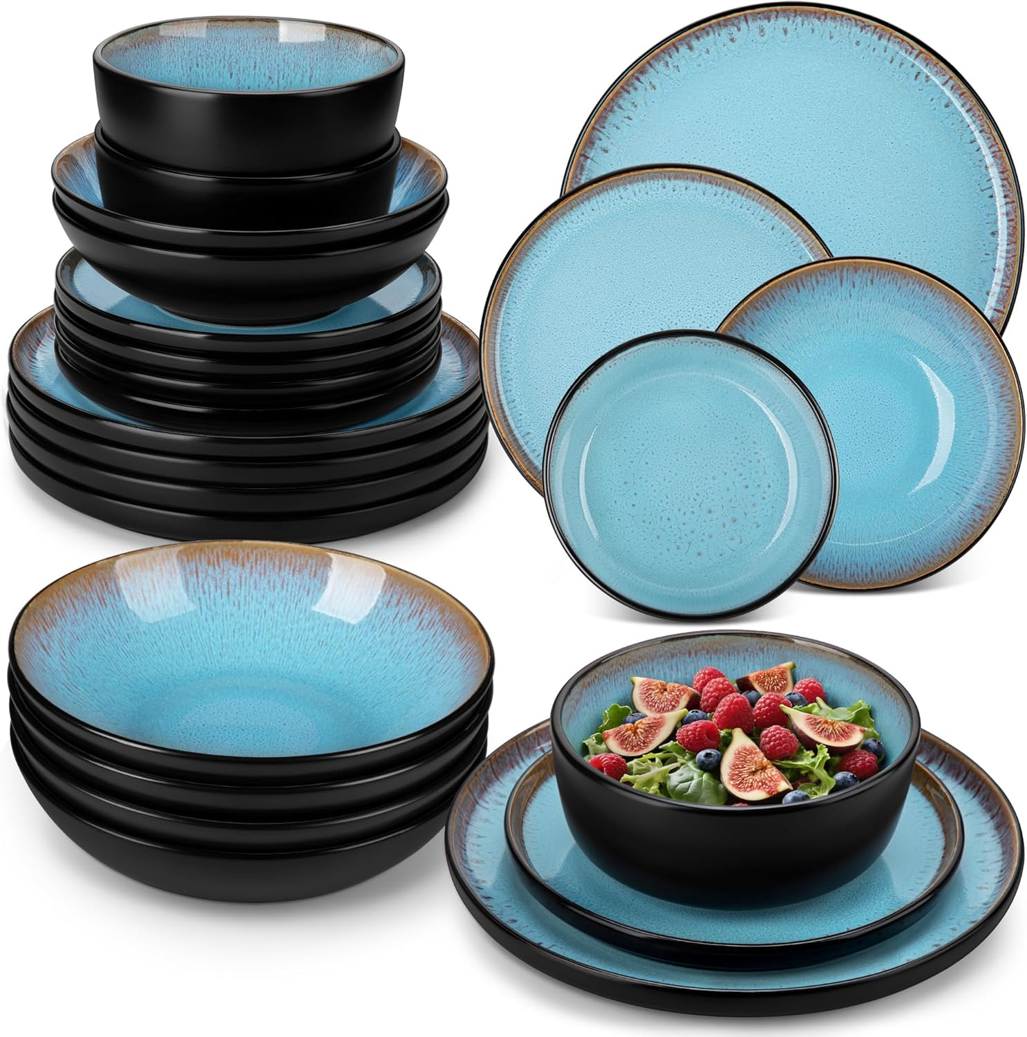 Homikit Dinner Sets for 6 People, 18-Piece Reactive Glaze Dinnerware Stoneware Set, Kitchen Plates and Bowls for Home Dinner Camping, Scratch Resistant, Dishwasher & Microwave Safe, Nebulas Blue