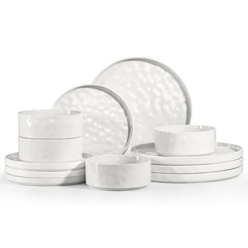 Homikit 12 Piece Dinner Sets, Reactive Glaze Plates and Bowls Set for 4 People, Elegant Dinnerware Stoneware for Kitchen Dinner Camping, Scratch Resistant, Dishwasher & Microwave Safe, Pearl White