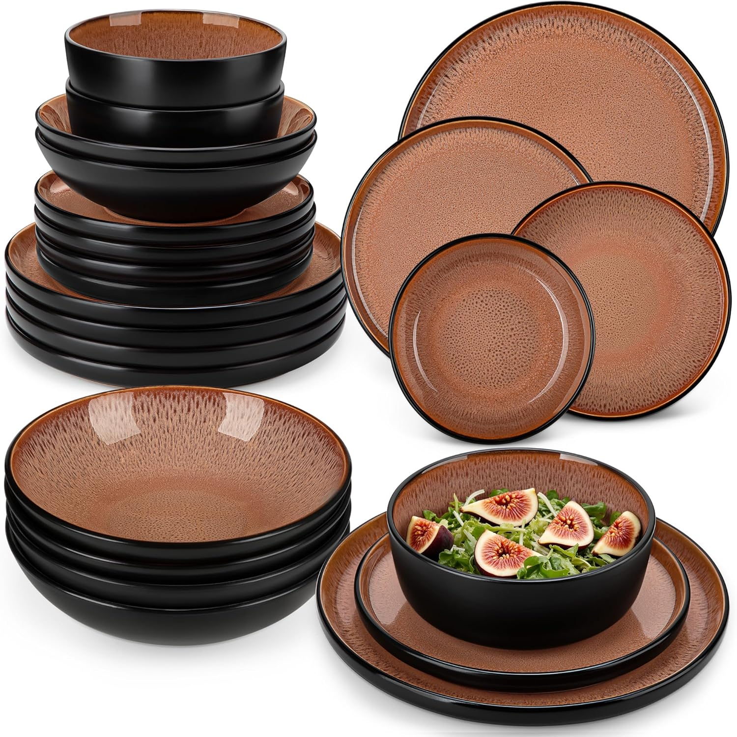 Amber 24 Pieces Dinner Set for 6, Reactive Glaze Stoneware Plates and Bowls Set,