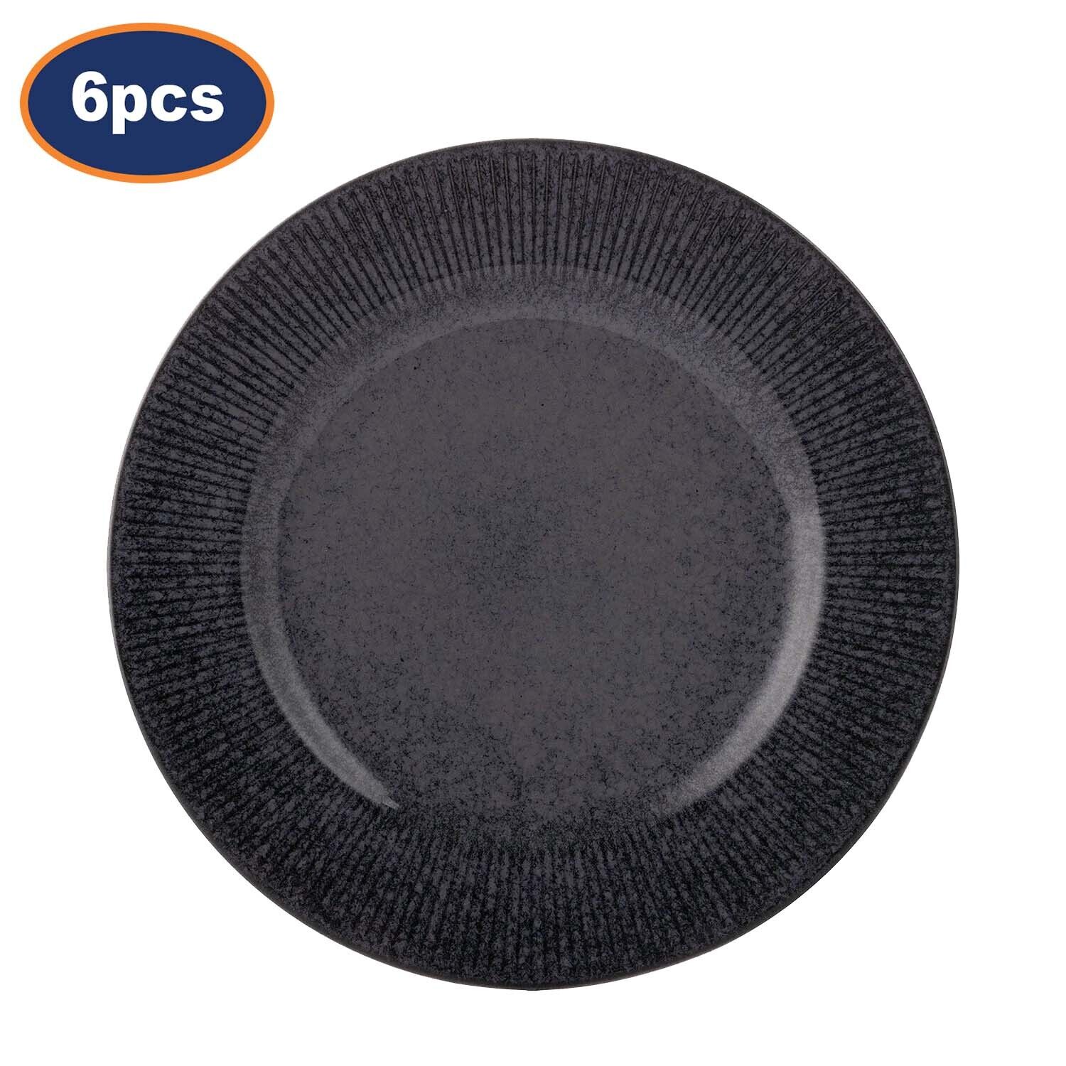 Stoneware Dinner Plate 27cm Round Black Linear Reactive Glaze Crockery 6pc Set