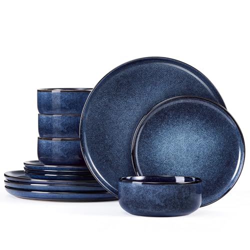 Homikit 12 Piece Dinner Set, Reactive Glaze Kitchen Dinnerware Sets for 4, Elegant Stoneware Included Plates and Bowls, Non-Scratch & Sturdy, Dishwasher & Microwave Safe, Nebulas Blue