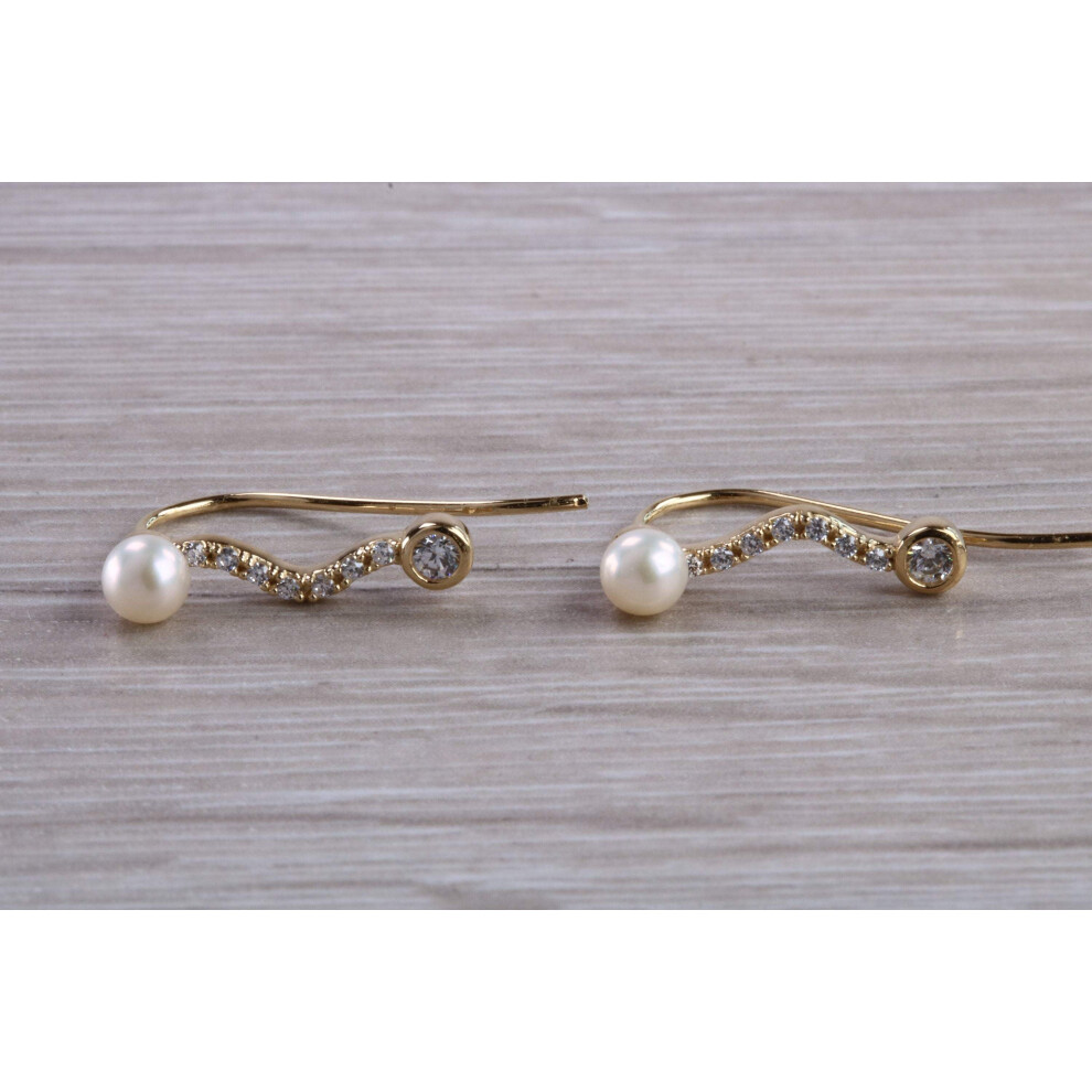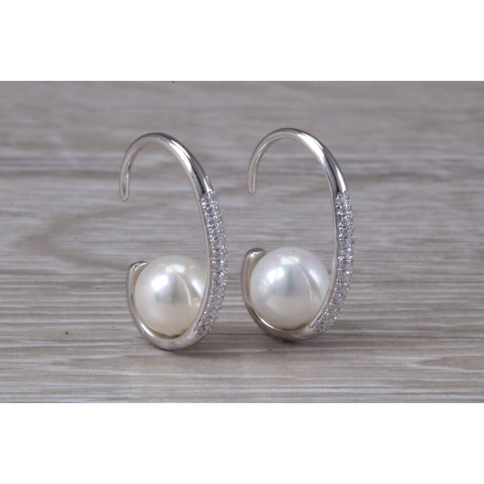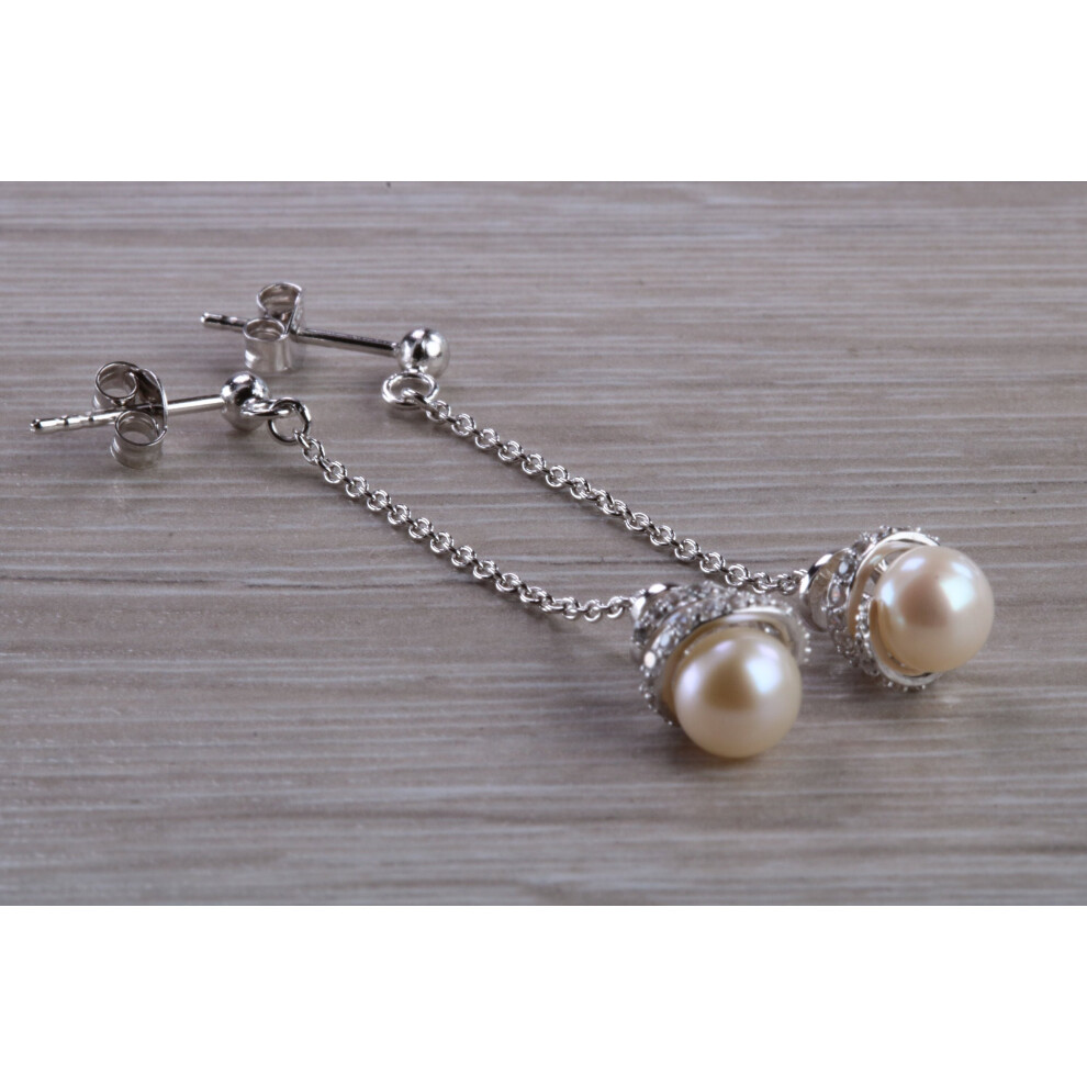 Sterling Silver Dropper earrings set with Real Pearl and C Z