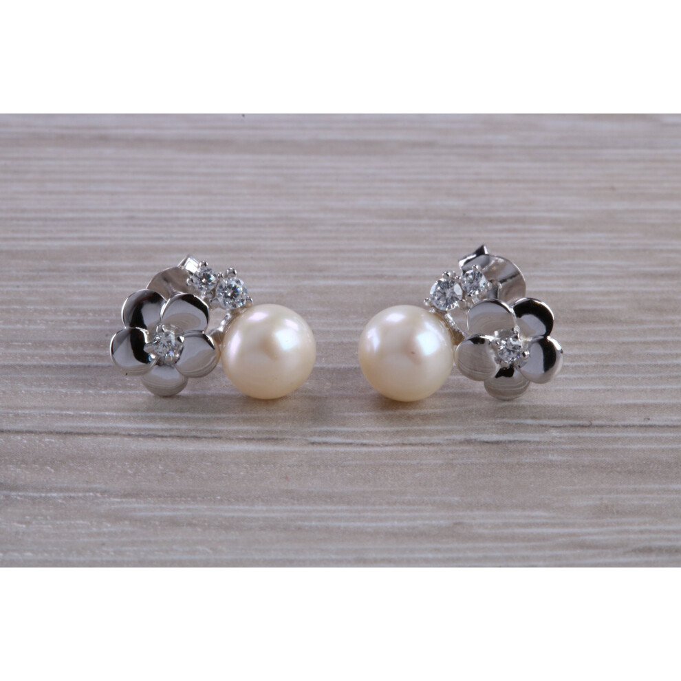Sterling Silver Real Pearl and C Z set Stud Earrings