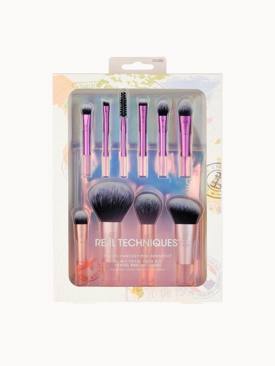 Real Techniques Travel Fanstasy Brush Kit, Makeup Brushes, Mini Sized, Perfect For Travel or On The Go, 10 Piece Set, Purple