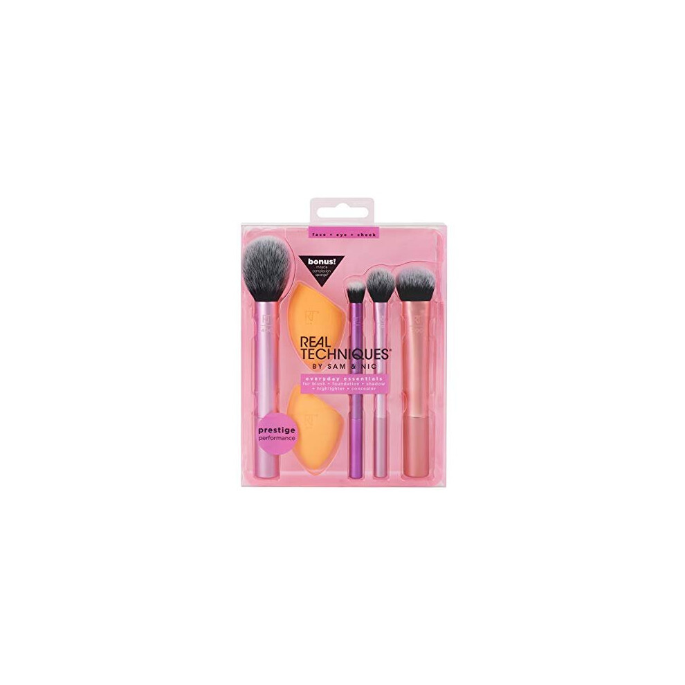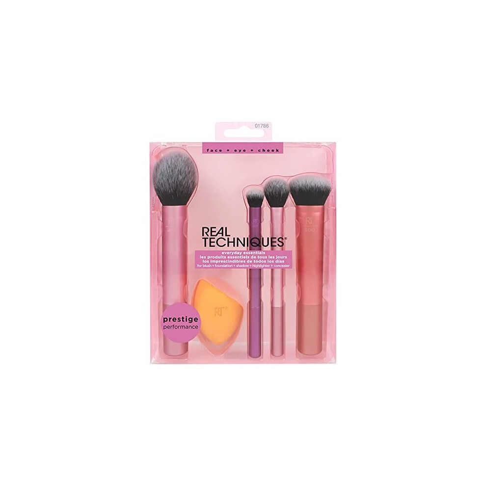 REAL TECHNIQUES,5 Count (Pack of 1) Everyday Essentials Makeup Brush Complete Face Set (Miracle Complexion Sponge, Expert Face, Blush, Setting and