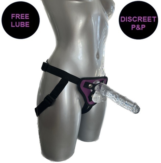 Strap On Pegging Kit 7 Inch Realistic CLEAR Dildo with Balls + PURPLE Harness