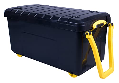 Really Useful Plastic Storage Box 160 Litre Wheeled trunk in Black (Yellow Wheels+Handles)