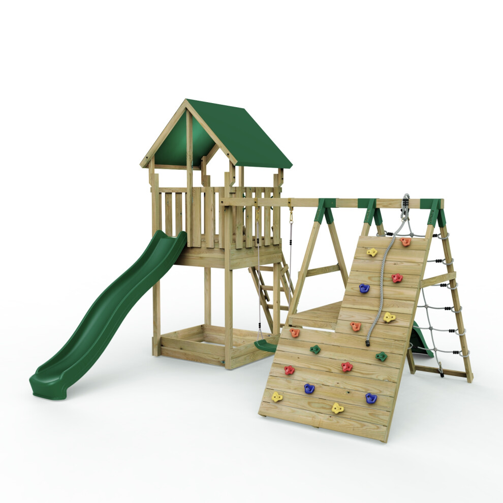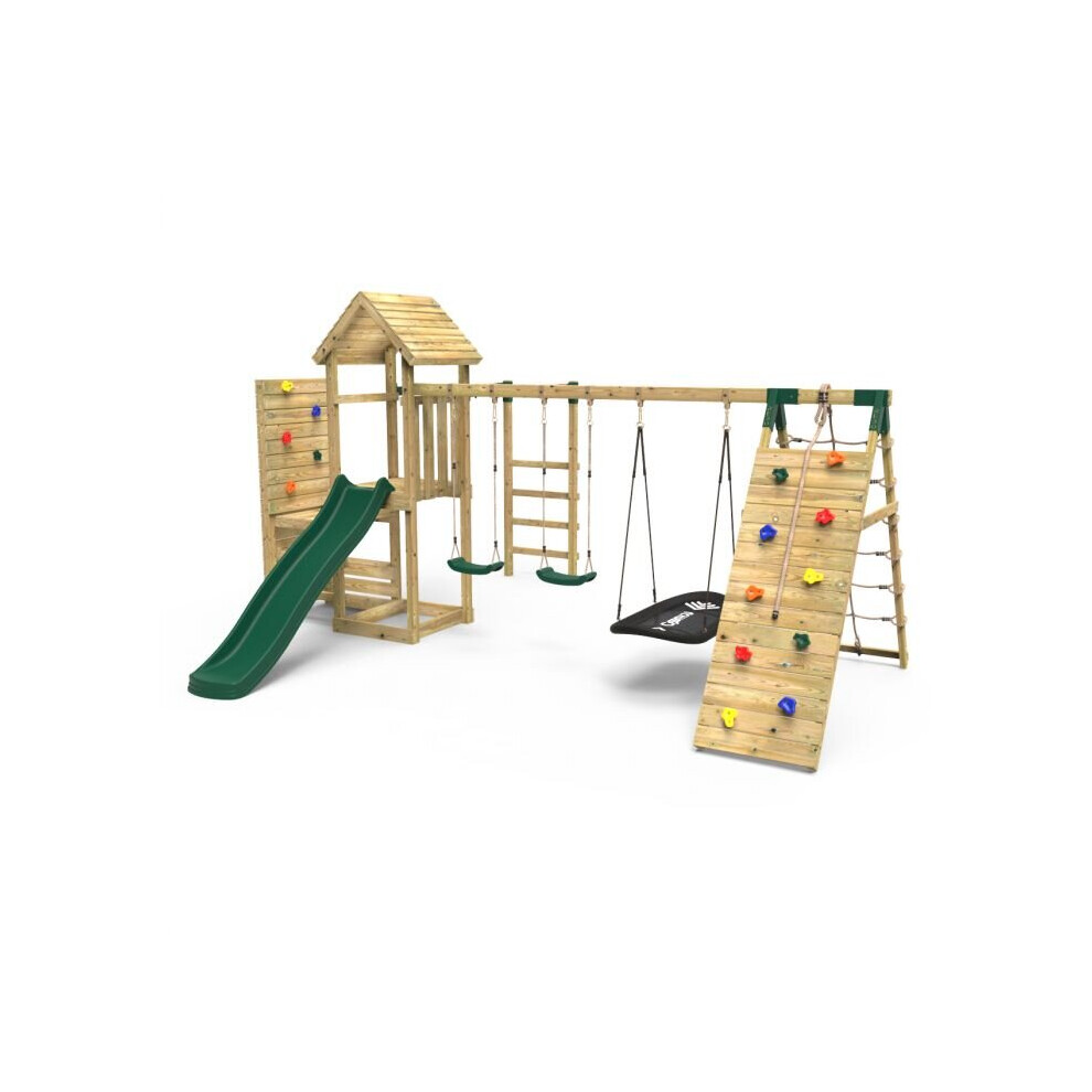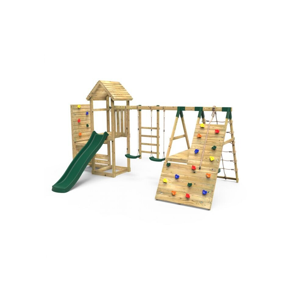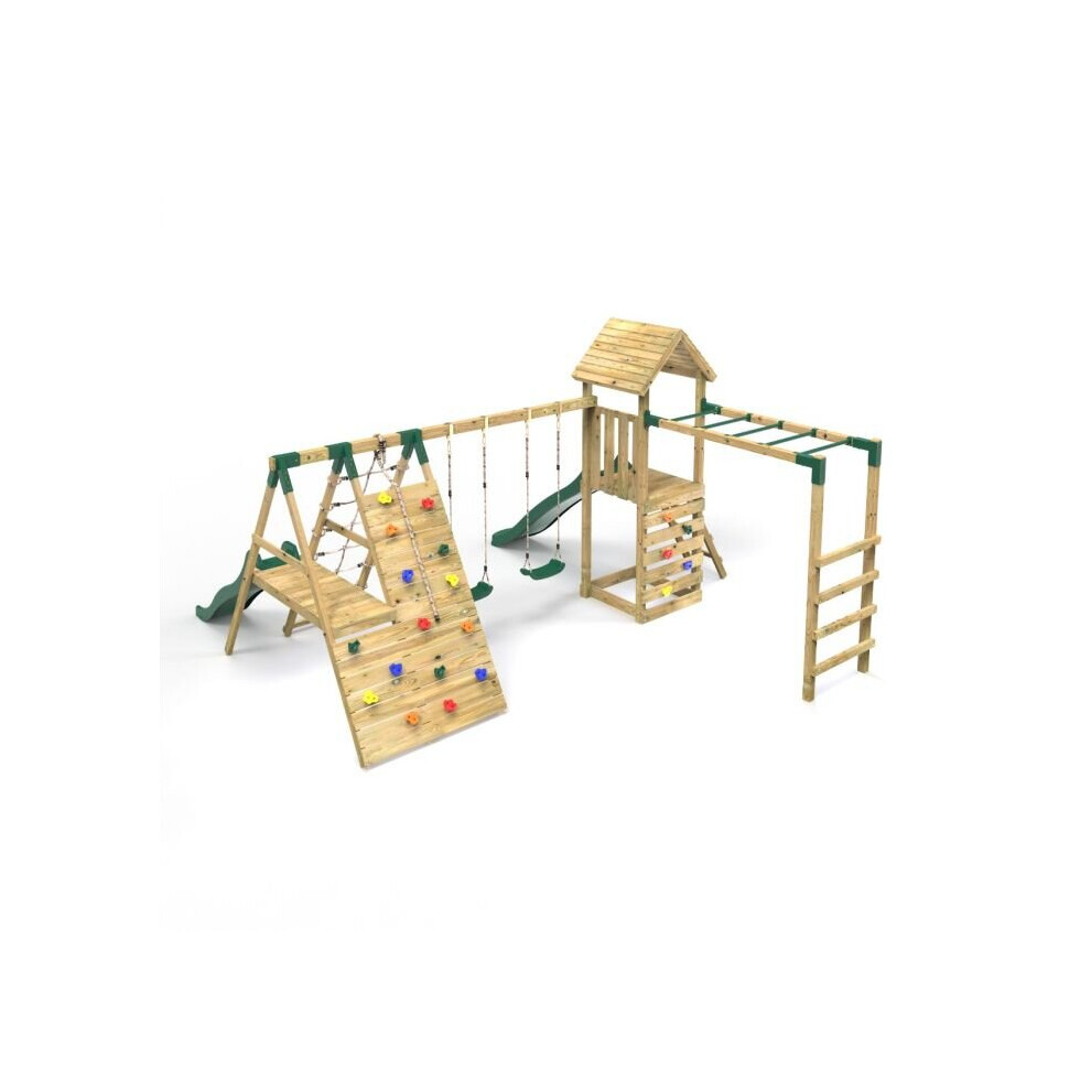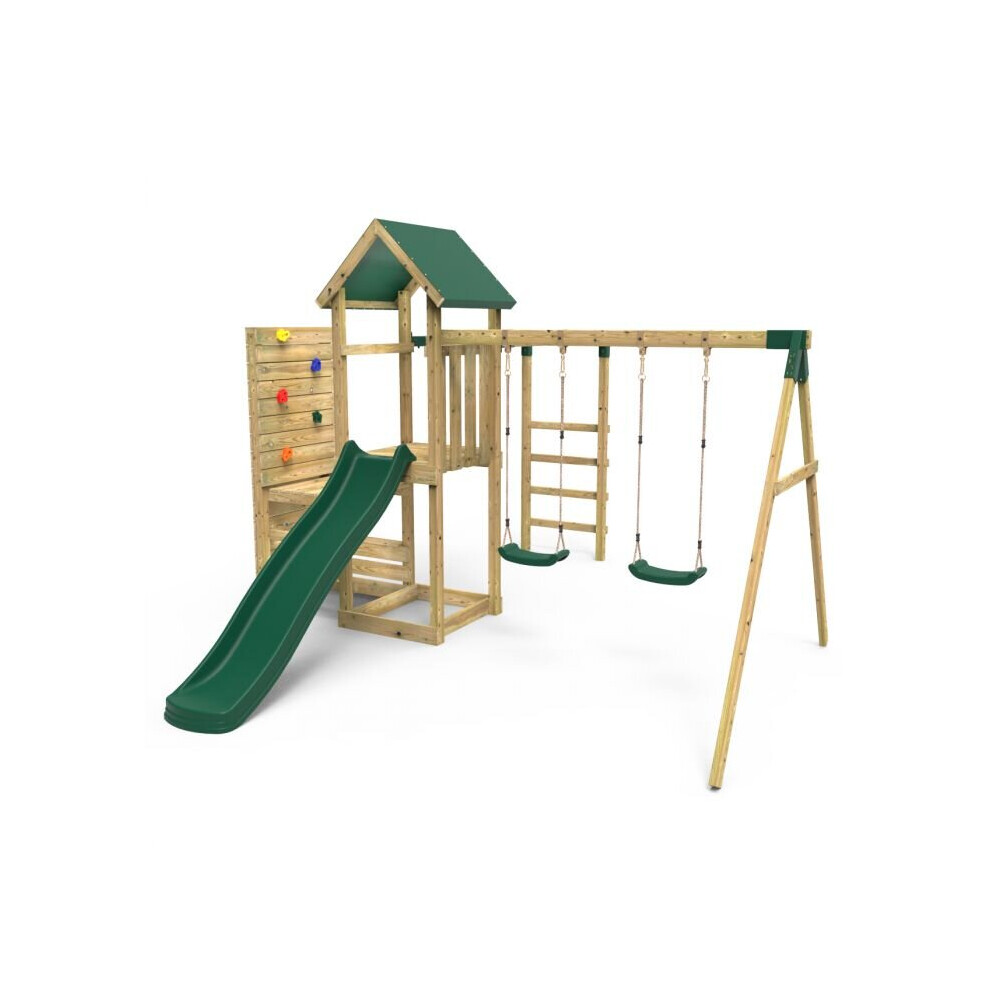 Rebo® Wooden Climbing Frame with Swings, 6 and 8ft Slides and Climbing Wall - Crestone Green | OutdoorToys | Pressure Treated Timber, Sturdy Wooden Construction