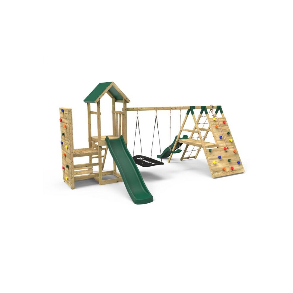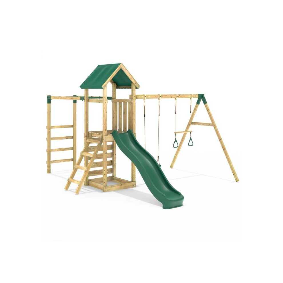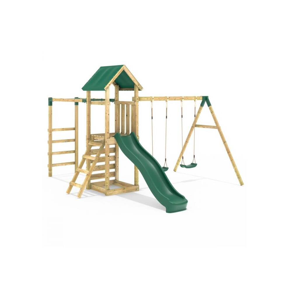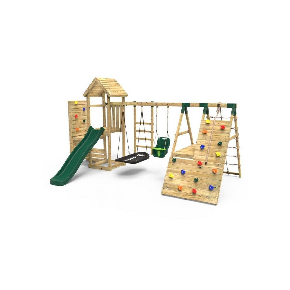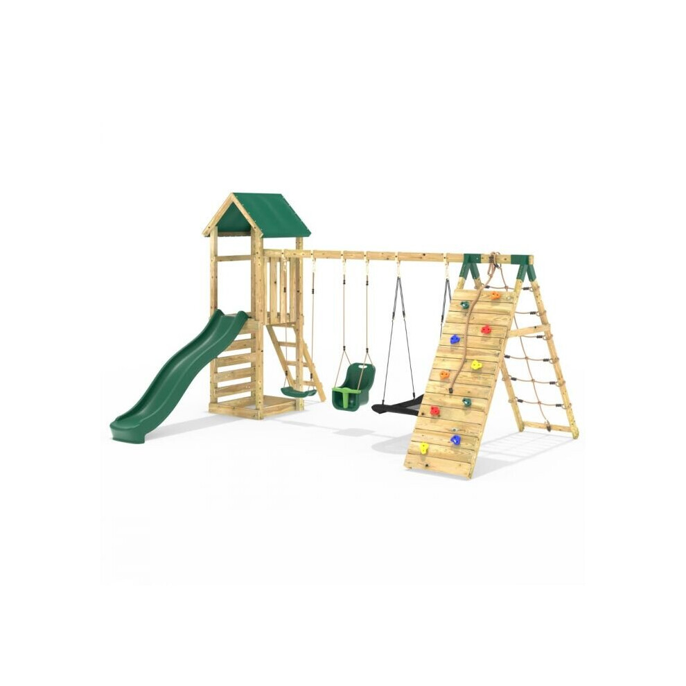 Rebo® Wooden Climbing Frame with Swings, 6 and 8ft Slides and Climbing Wall - Crestone Green | OutdoorToys | Pressure Treated Timber, Sturdy Wooden Construction