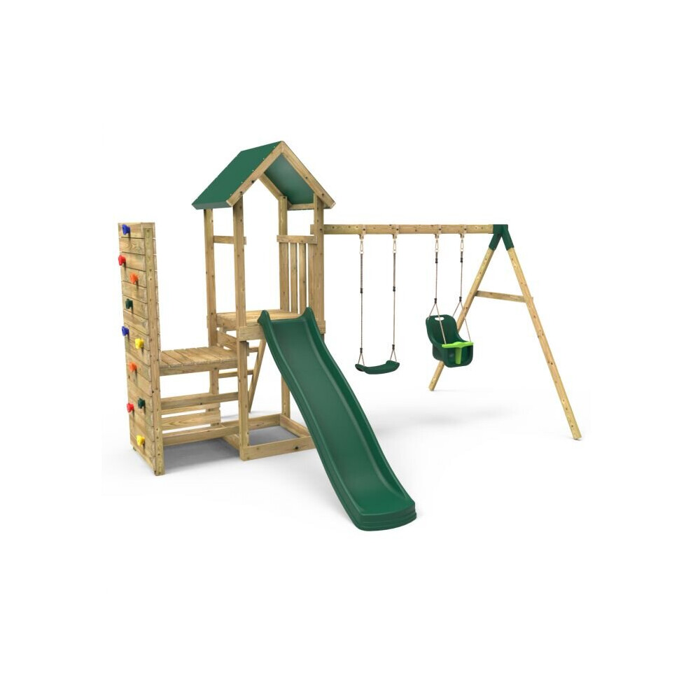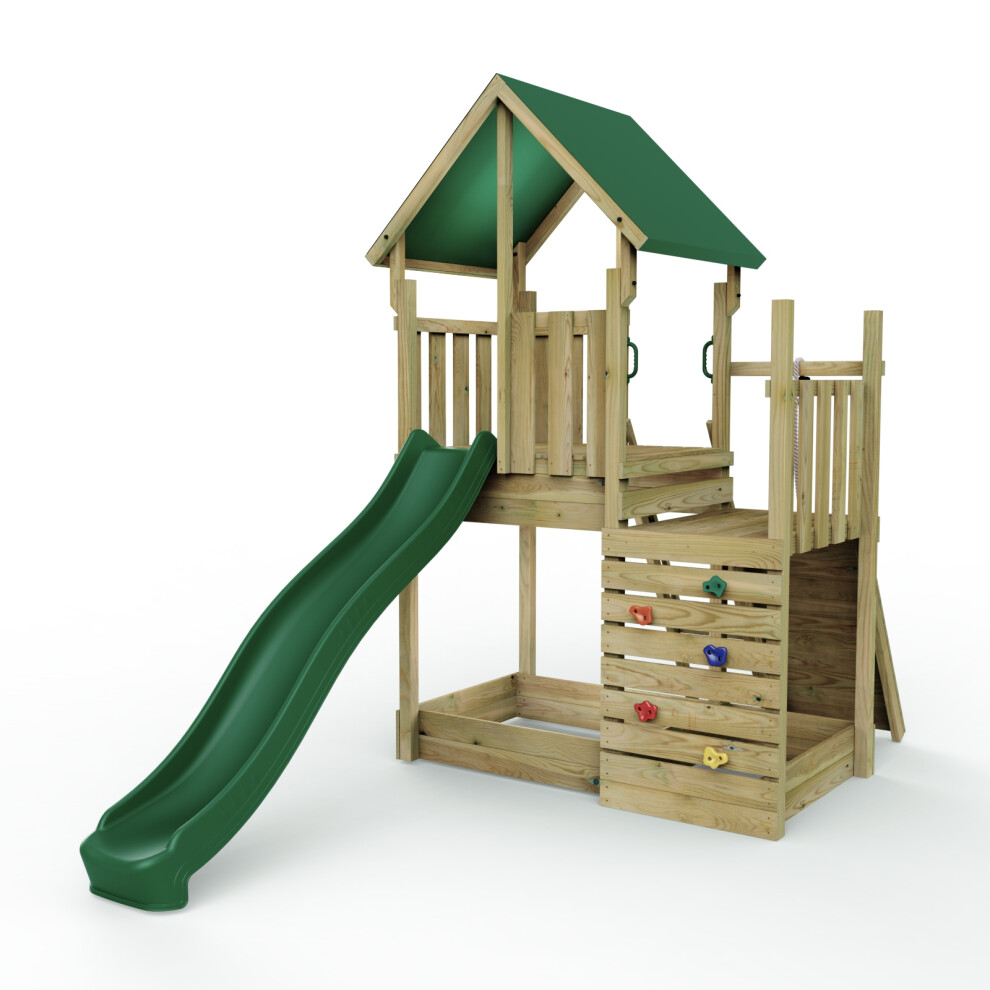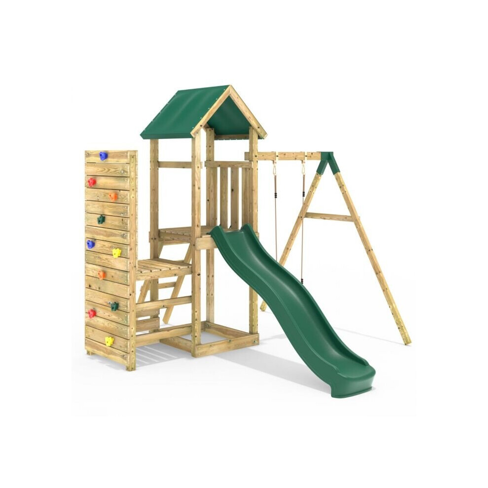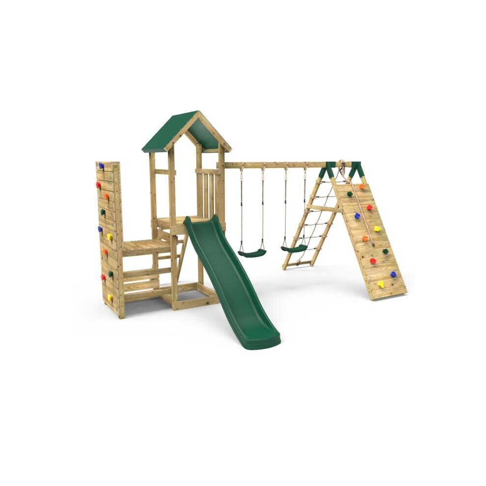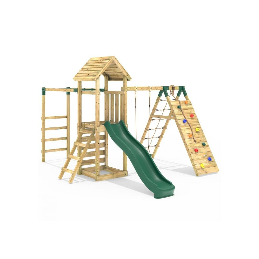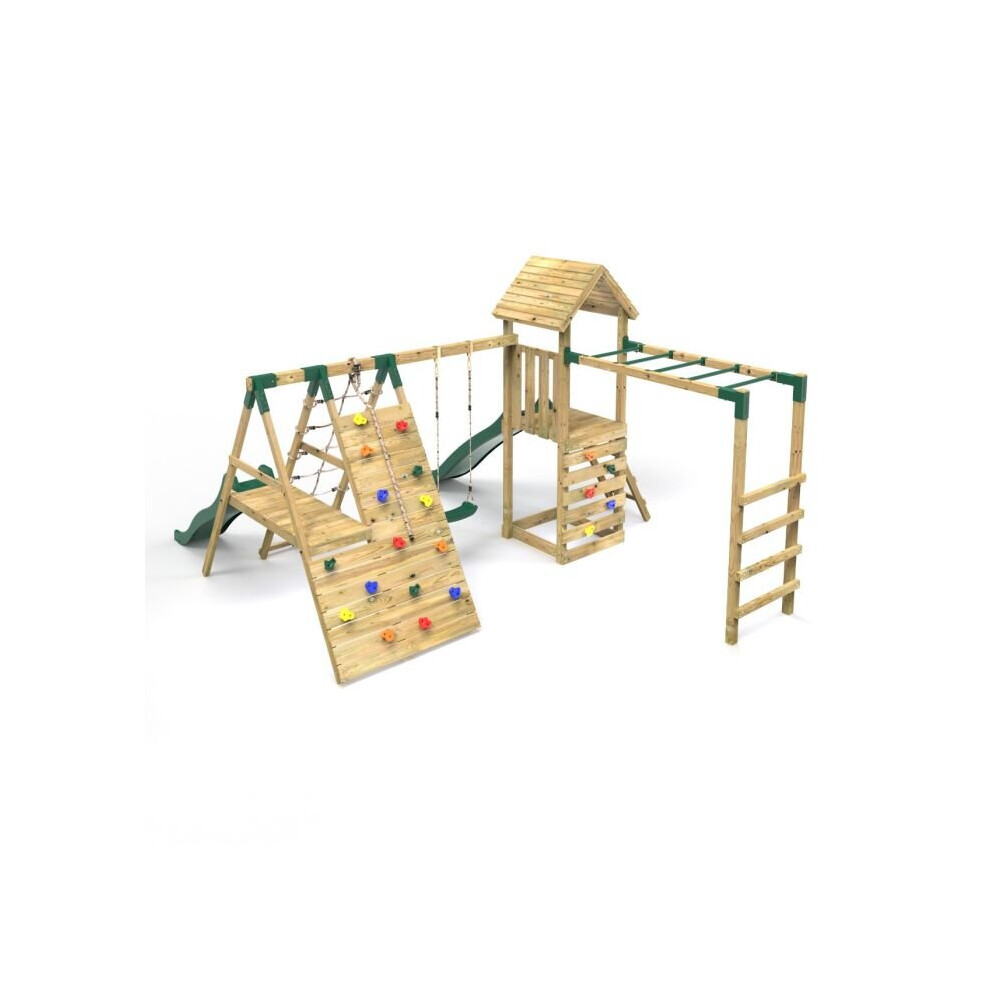 Rebo® Wooden Climbing Frame with Swings, 6 and 8ft Slides and Climbing Wall - Crestone Green | OutdoorToys | Pressure Treated Timber, Sturdy Wooden Construction