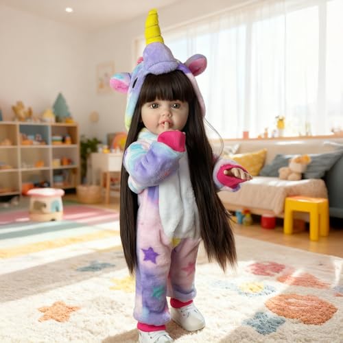 Pinky Reborn Baby Dolls Stand 22 inch Reborn Baby Doll Full Body Vinyl Princess Girl Realistic Newborn Doll with Anatomically Correct Long Hair (Black Hair)