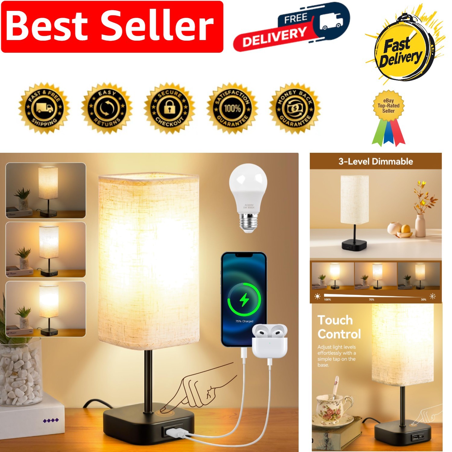 Table-Lamp-Bedside-Touch-Control-Dimmable-Charging-Rechargeable USB A+C Charger Ports 3-Way Dimmer Linen Fabric Shade Lamps LED Tables Lampe Reading Night Modern Lights Bedroom Living Bed Side Lounge