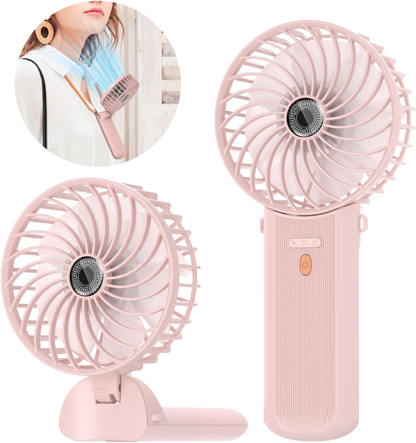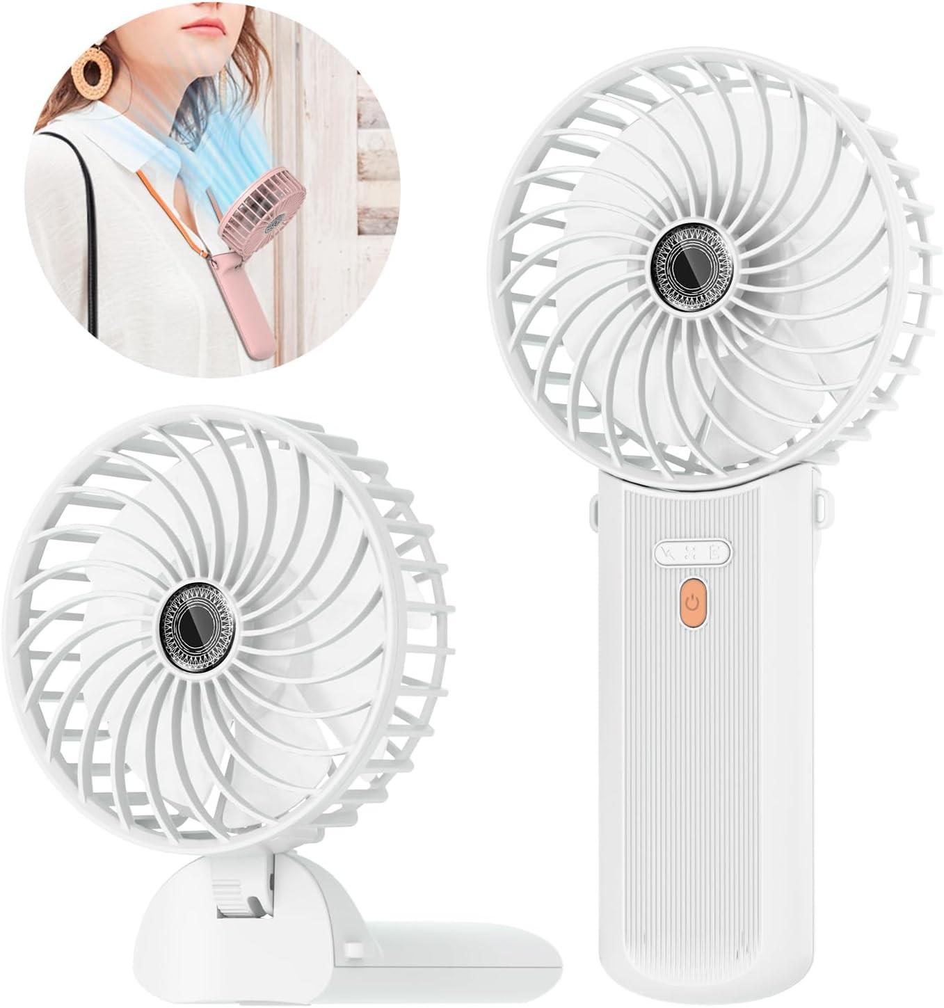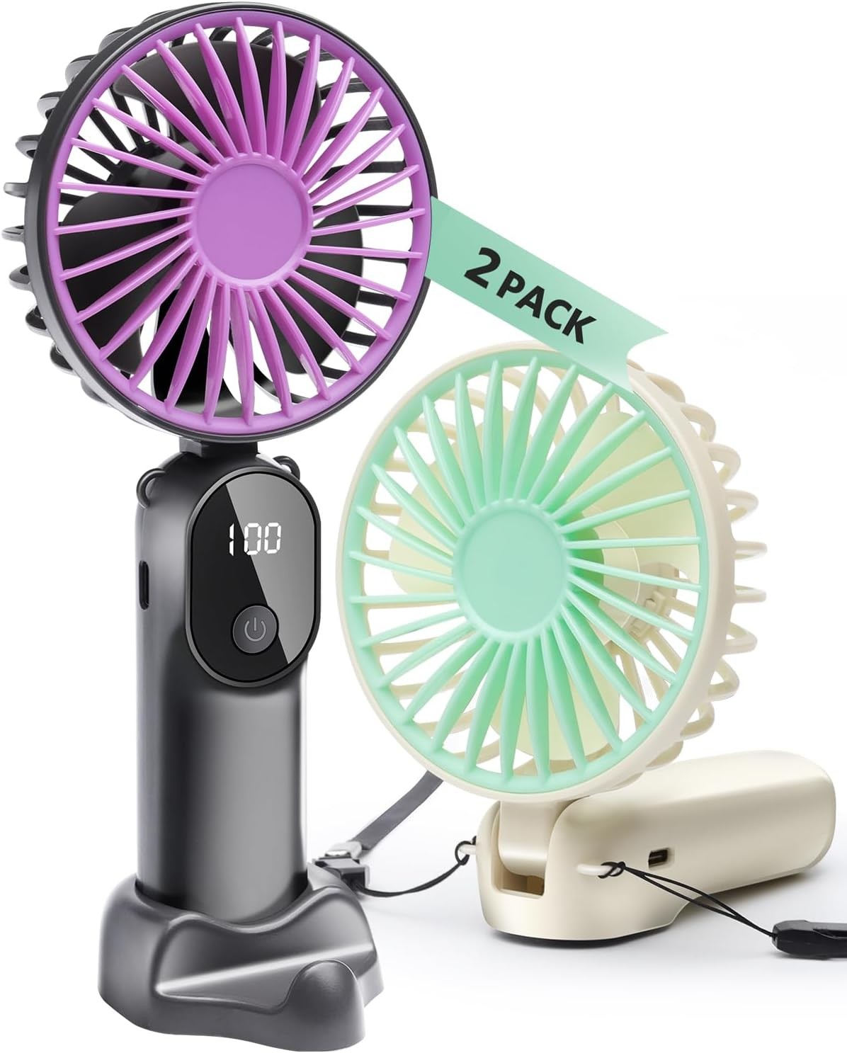STRHAGO 2 Pcs Portable Handheld Fans, Mini USB Rechargeable Fans with Neck Strap & Detachable Desk Base, 90° Foldable, 6 Speeds, Hand Held Fans for Outdoor, Home, Office, Travel, Camping&Commute