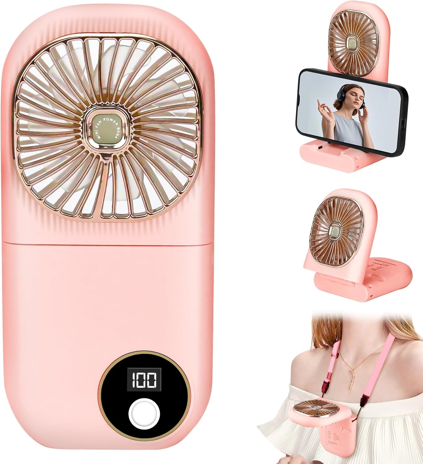 Lepwings Portable Mini Handheld Fan - Rechargeable Neck Hanging Fans with 16-Hour Cooling, Personal Handy Fan 4-Speeds Foldable Pocket Fan for Summer Outdoor Travel Home Office - Pink