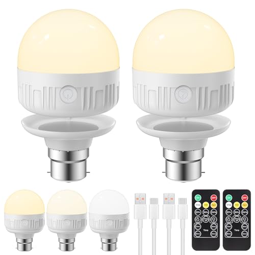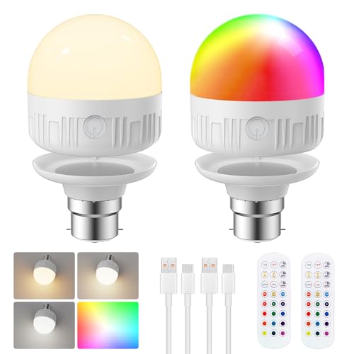 Lamptobe B22 Rechargeable Light Bulb,1.5W LED Dimmable Rechargeable Night Light with Remote Control, 3 Color Temperatures, Bayonet Detachable Cordless Bulb for Non - Hardwired Lamps, 2 Pack