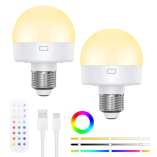 USB Rechargeable Light Bulb with Remote Control, Dimmable Colour Bulbs with Timing, Detachable RGB LED Bulb with E27 & E14 Bases, Battery Powered, 12+3 Color Temperatures, for Non Hardwired Lamps