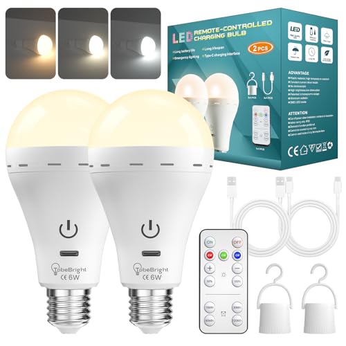 TobeBright Rechargeable Light Bulb with Remote, 6W Touch Control E27 LED Bulb, 3 Colour Temperatures Adjustable + 10-100% Dimmable, Outdoor Camping Emergency LED Light Bulb with Hook, 2 Pack